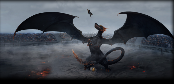| “ | And there was the Horntail, at the other end of the enclosure, crouched low over her clutch of eggs, her wings half furled, her evil, yellow eyes upon him, a monstrous, scaly black lizard, thrashing her spiked tail, leaving yard-long gouge marks in the hard ground. | ” |