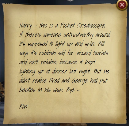 Harry – this is a Pocket Sneakoscope. If there’s someone untrustworthy around, it’s supposed to light up and spin. Bill says it’s rubbish sold for wizard tourists and isn’t reliable, because it kept lighting up at dinner last night. But he didn’t realise Fred and George had put beetles in his soup. Bye – Ron |