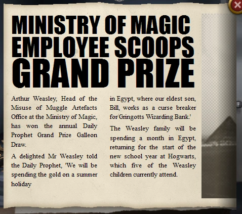 Ministry of Magic employee scoops grand prize Arthur Weasley, Head of the Misuse of Muggle Artefacts Office at the Ministry of Magic, has won the annual Daily Prophet Grand Prize Galleon Draw. A delighted Mr Weasley told the Daily Prophet, 'We will be spending the gold on a summer holiday in Egypt, where our eldest son, Bill, works as a curse breaker for Gringotts Wizarding Bank.' The Weasley family will be spending a month in Egypt, returning for the start of the new school year at Hogwarts, which five of the Weasley children currently attend. |