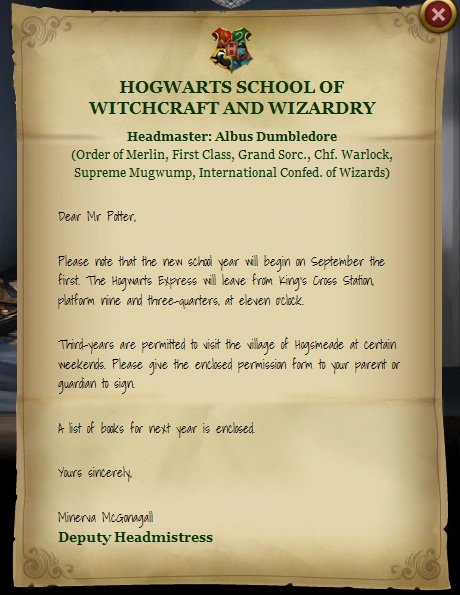 Dear Mr Potter, Please note that the new school year will begin on September the first. The Hogwarts Express will leave from King’s Cross Station, platform nine and three-quarters, at eleven o’clock. Third-years are permitted to visit the village of Hogsmeade at certain weekends. Please give the enclosed permission form to your parent or guardian to sign. A list of books for next year is enclosed. Yours sincerely, Minerva McGonagall Deputy Headmistress |