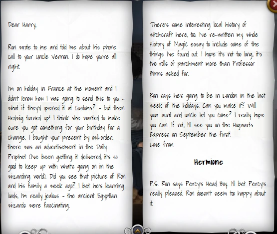 Dear Harry, Ron wrote to me and told me about his phone call to your Uncle Vernon. I do hope you’re all right. I’m on holiday in France at the moment and I didn’t know how I was going to send this to you – what if they’d opened it at Customs? – but then Hedwig turned up! I think she wanted to make sure you got something for your birthday for a change. I bought your present by owl-order; there was an advertisement in the Daily Prophet (I’ve been getting it delivered, it’s so good to keep up with what’s going on in the wizarding world). Did you see that picture of Ron and his family a week ago? I bet he’s learning loads, I’m really jealous – the ancient Egyptian wizards were fascinating. There’s some interesting local history of witchcraft here, too. I’ve re-written my whole History of Magic essay to include some of the things I’ve found out. I hope it’s not too long, it’s two rolls of parchment more than Professor Binns asked for. Ron says he’s going to be in London in the last week of the holidays. Can you make it? Will your aunt and uncle let you come? I really hope you can. If not, I’ll see you on the Hogwarts Express on September the first! Love from