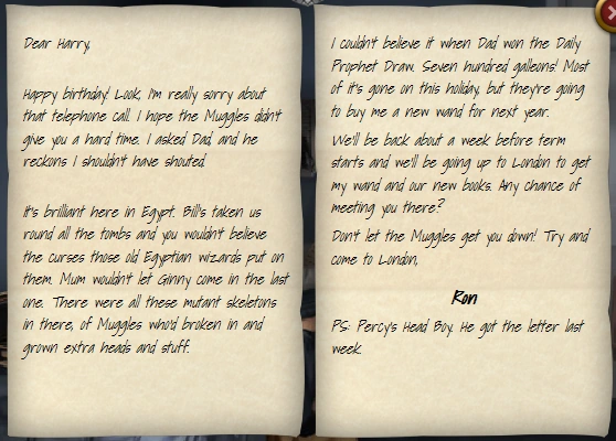 Dear Harry, Happy birthday! Look, I’m really sorry about that telephone call. I hope the Muggles didn’t give you a hard time. I asked Dad, and he reckons I shouldn’t have shouted. It’s brilliant here in Egypt. Bill’s taken us round all the tombs and you wouldn’t believe the curses those old Egyptian wizards put on them. Mum wouldn’t let Ginny come in the last one. There were all these mutant skeletons in there, of Muggles who’d broken in and grown extra heads and stuff. I couldn’t believe it when Dad won the Daily Prophet Draw. Seven hundred galleons! Most of it’s gone on this holiday, but they’re going to buy me a new wand for next year. We’ll be back about a week before term starts and we’ll be going up to London to get my wand and our new books. Any chance of meeting you there? Don’t let the Muggles get you down! Try and come to London,