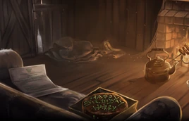 The wind still whistles around the hut. The hut creaks a lot and the fireplace crackles.
