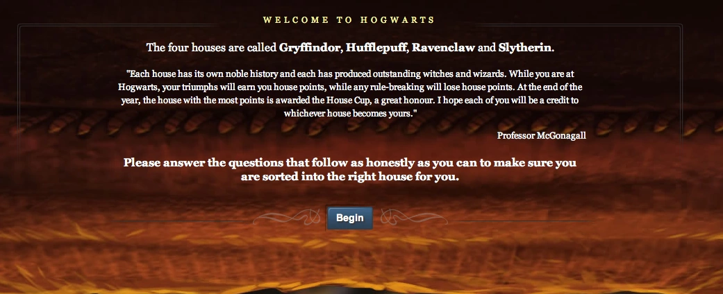 This moment contains the Sorting Quiz to get the player sorted into one of the four houses.